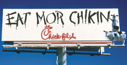 A prime example is Chick-fil-A, with its famed, nation-wide billboard campaign depicting cows writing the words "Eat Mor Chikin." The campaign has been in use since 1995.