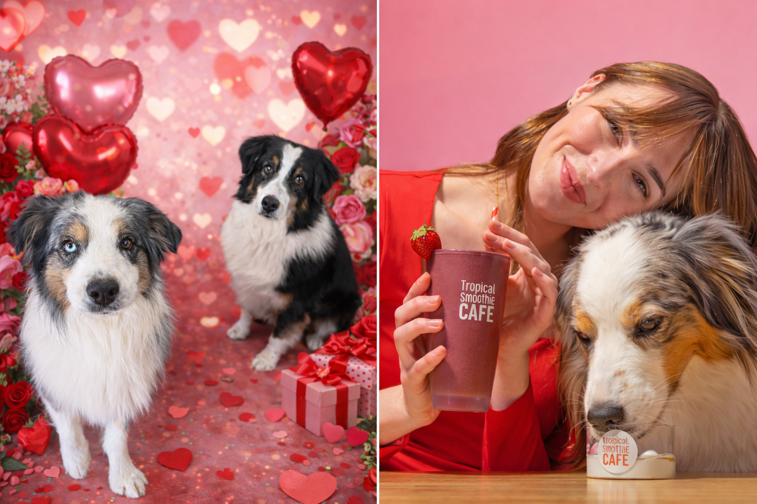 | Is it just me, or could my dogs, Fin and Jake, (left) be the inspiration behind Tropical Smoothie's photo shoot? |