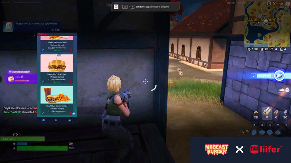 Video gamers don't have to stop playing when they're hungry, thanks to Liifer Technologies and Virtual Dining Concepts teaming up to allow users to order MrBeast Burger directly within video games.