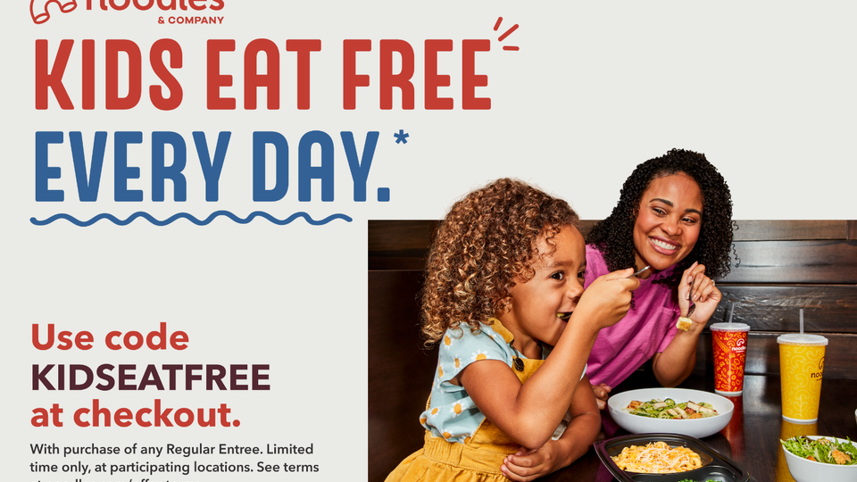 Noodles & Co. guests will receive a free kids' meal by purchasing any regular entree for a limited time. They may redeem the free kids' meal offer in restaurants, through the Noodles app or online at Noodles.com, using the code KIDSEATFREE.