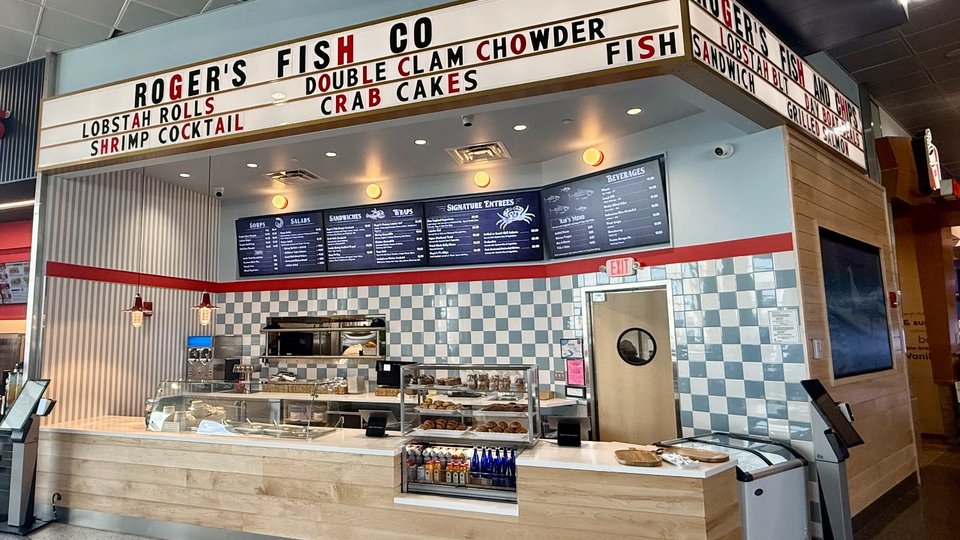 The "modern-day fish shack" offers counter service and a streamlined menu designed for the pace of air travel. Featured items include a "Double Clam Chowder," lobster BLTs on baguettes, and "Roger's F'n Chips" made with fried haddock. The location also serves beer, cider and frozen cocktails.