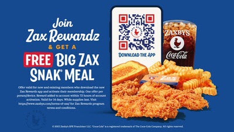 Amid rising loyalty cutbacks in the restaurant industry, Zaxby's is rewarding its most loyal fans by extending its welcome offer — a free Big Zax Snak meal — for downloading and joining its Zax Rewardz program. The meal features three Chicken Fingerz, Texas Toast and Zax Sauce served with Crinkle Fries and a small Coca-Cola Freestyle drink.
